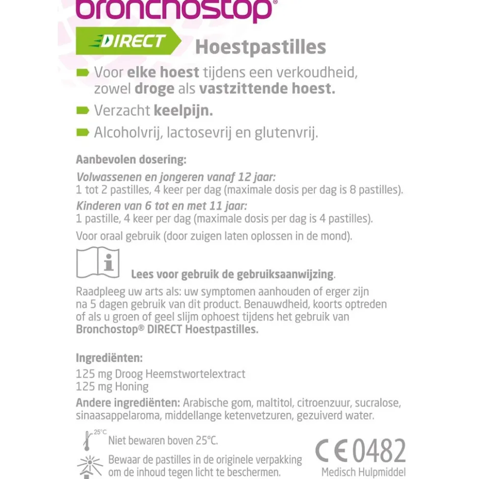 Bronchostop Direct Hoestpastilles verlichten snel elke hoest tijdens een verkoudheid, voor zowel droge als vastzittende hoest, en verzachten keelpijn.
