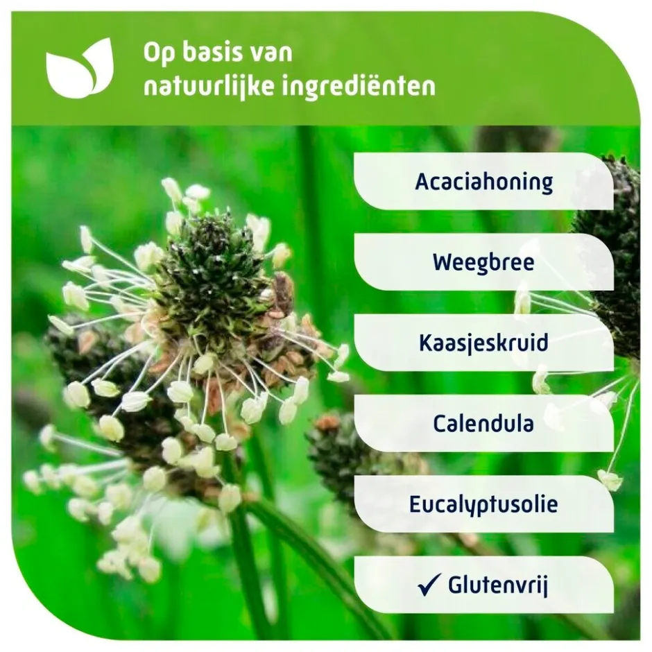 • Met natuurlijke ingrediënten (plantextracten van weegbree, kaasjeskruid, heemst en grindelia)