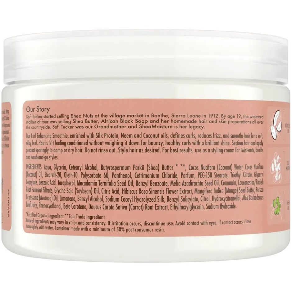 SheaMoisture Coconut & Hibiscus Curl Enhancing Smoothie is verrijkt met natuurlijke ingrediënten en een formule tegen pluizig haar voor soepele, zijdezachte en gedefinieerde krullen! De smoothie is verrijkt met fairtrade-sheaboter uit Ghana en verzacht gespleten haarpunten. Je beschadigde, overbehandelde krullen worden weer veerkrachtig en glanzend.