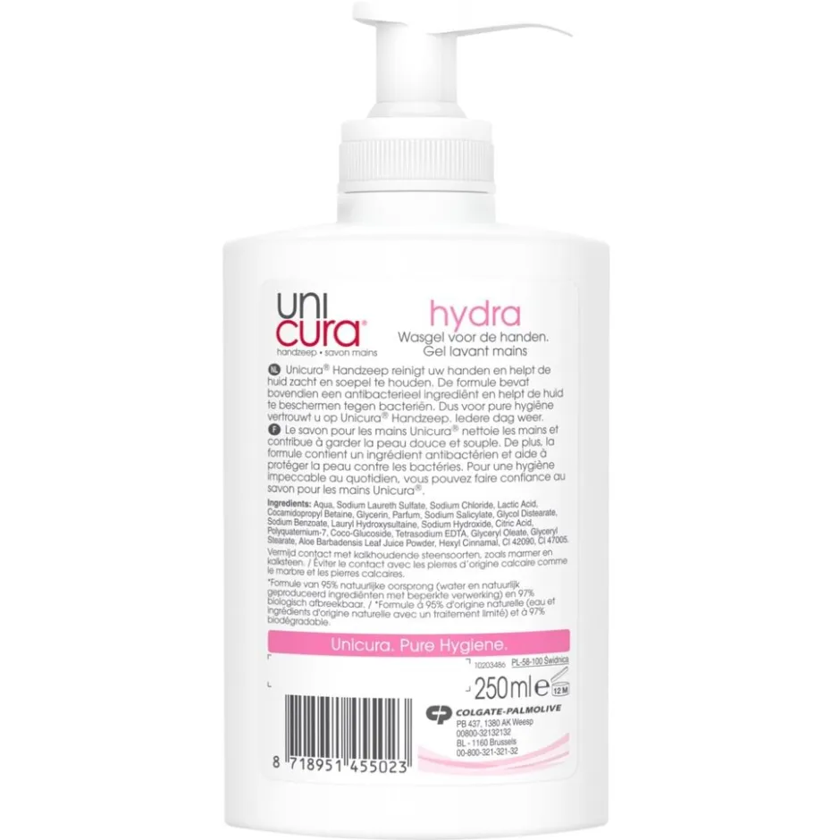 Unicura Hydra Handzeep zorgt elke dag voor schone handen. De formule met een anti-bacteriëel ingrediënt beschermt je handen effectief tegen elke vorm van bacteriën die je tegenkomt tijdens je dagelijkse bezigheden.