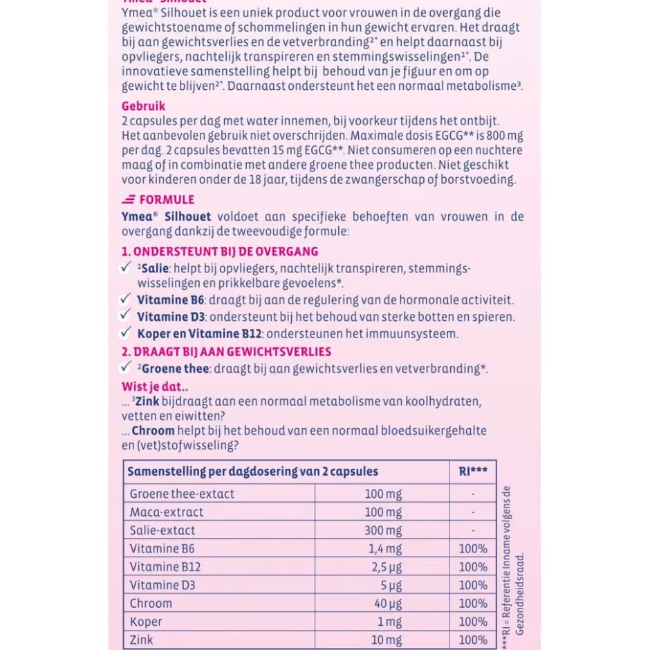 Ymea Silhouet is een fytoproduct. Dit betekent dat de hoofdingrediënten plantenextracten zijn die niet worden verdund.