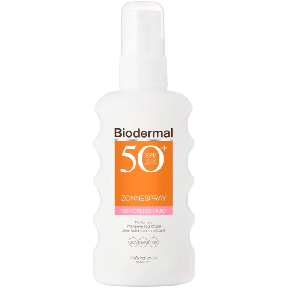 De Biodermal Gevoelige Huid SPF50+ Zonnespray is dermatologisch getest en parfumvrij. Met deze waterresistente zonnespray kun je gerust het water in!