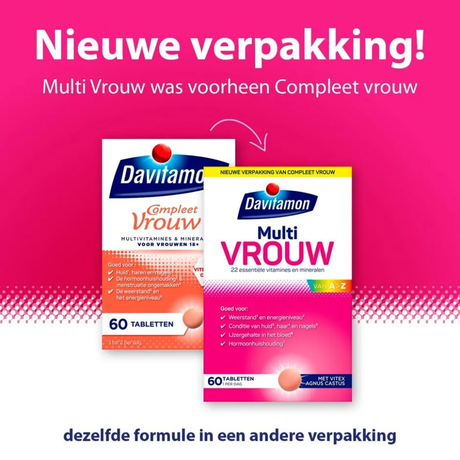 Davitamon Multi Vrouw Tabletten bevatten per tablet 22 essentiële vitaminen en mineralen. Ook bevatten Davitamon Multi Vrouw Tabletten het natuurlijke extract van Vitex agnus castus.