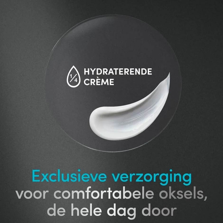 Deze antitranspirant is verrijkt met een unieke 1/4 hydraterende crème, die je okselhuid verzorgt. Irritaties door zweet en scheren behoren tot het verleden. Je krijgt een gehydrateerde en beschermde huid en gladde, comfortabel aanvoelende oksels.
