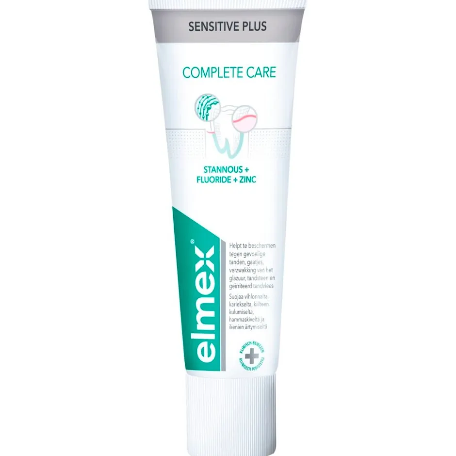 Elmex Sensitive Plus Complete Protection Tandpasta beschermt gevoelige tanden, remineraliseert je tandglazuur en beschermt tegen irritatie van je tandvlees bij regelmatig gebruik. De tandpasta helpt ook bij het voorkomen van gaatjes.