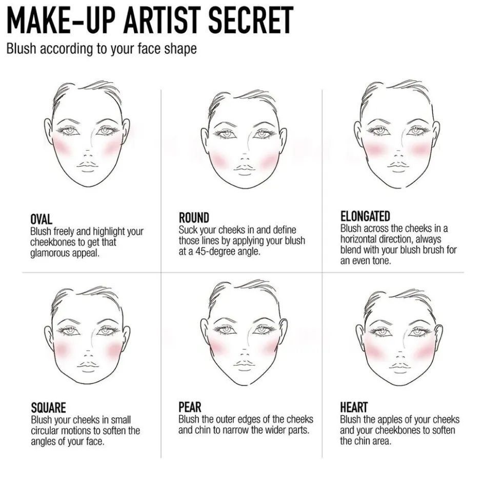 Glimlach in de spiegel en breng de blush in cirkelvormige bewegingen aan op de appeltjes van je wangen. Voor meer diepte kan je de blush verder uit blenden naar de buitenkant van je gezicht. Doe dit bij voorkeur in de richting van je oren of slapen.