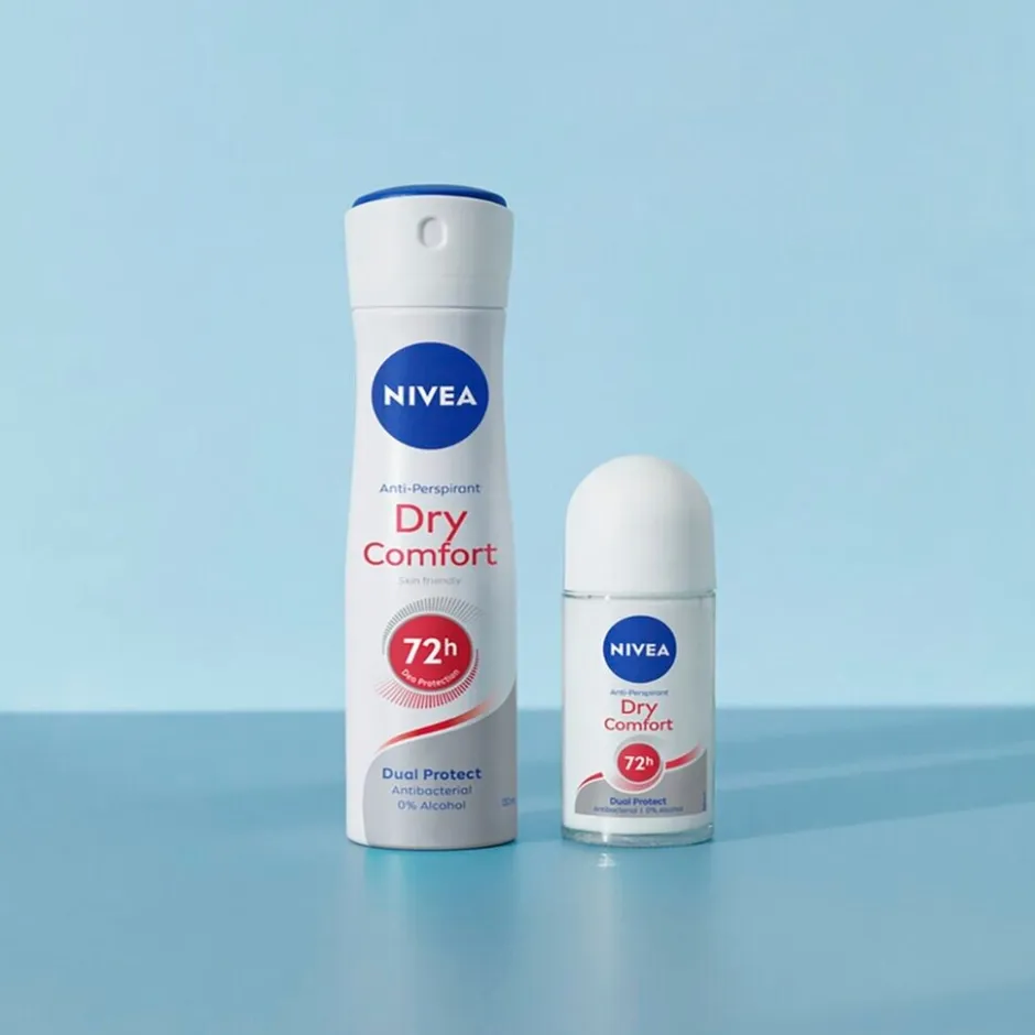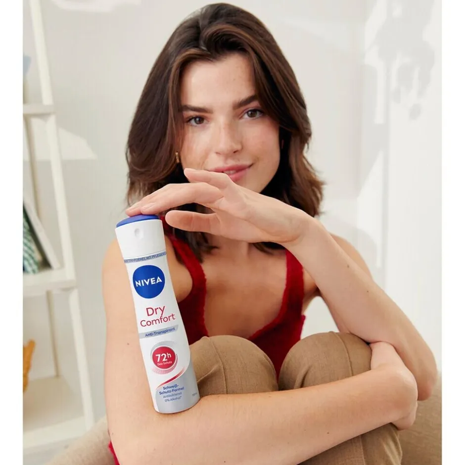 Ervaar het aangename gevoel van NIVEA Dry Comfort Antitranspirant Spray. Deze milde antitranspirant verzorgt je huid, beschermt haar 48 uur lang tegen transpiratie en zorgt voor een aangenaam droog gevoel.