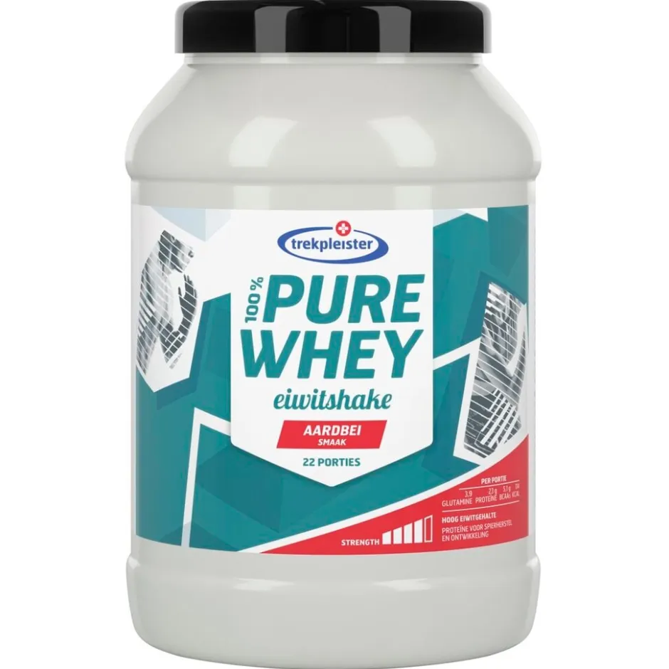 Trekpleister Strawberry 100% Pure Whey Protein Eiwitshake met aardbeiensmaak is een eiwitsupplement met een hoogwaardige samenstelling.