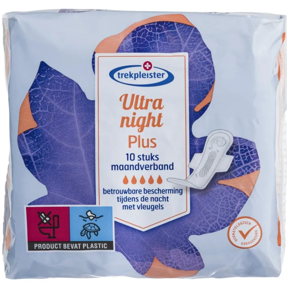Trekpleister Ultra Night Plus Maandverband is ultradun, biedt optimale bescherming en geeft een extreem droog en aangenaam gevoel. Door het speciale ultra-droog-systeem wordt het vocht snel in de binnenste kern opgenomen.