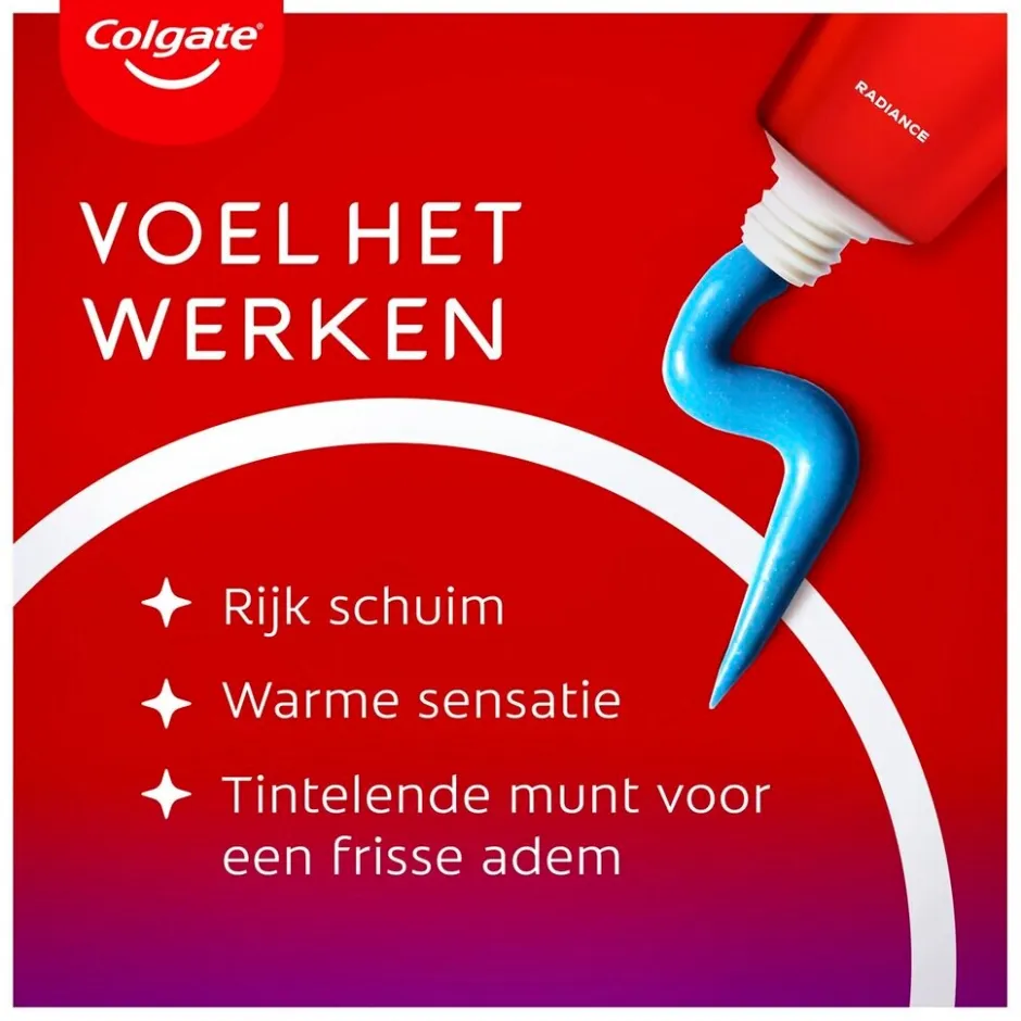 Met Colgate Max White Ultimate Radiance Tandpasta maak je je tanden op een veilige manier wit. De tandpasta verwijdert diepe vlekken op je tanden, veroorzaakt door eten, koffie, wijn en tabak.