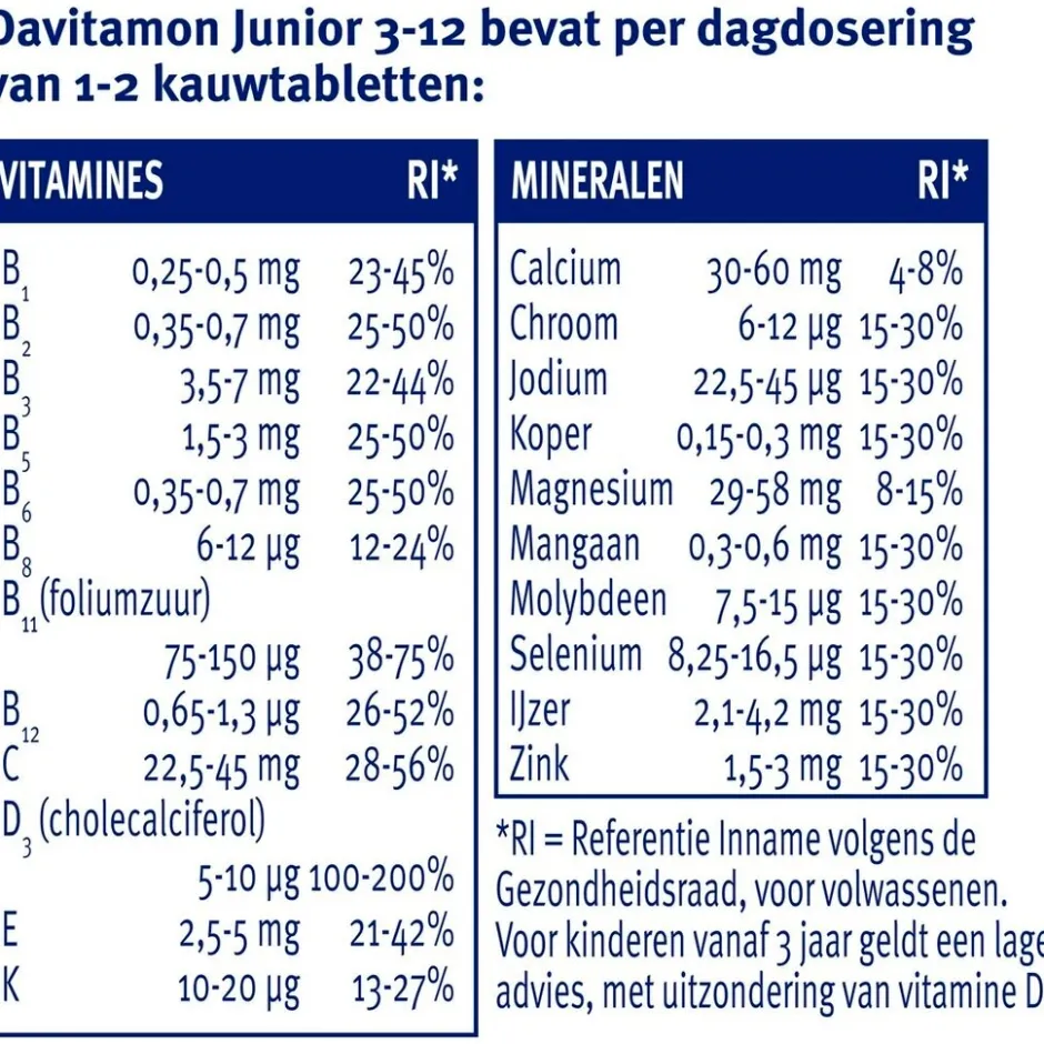 Davitamon Junior 3+ Banaan Kauwtabletten bevat veel vitamine D3, 100% van de ADH en is hierdoor: