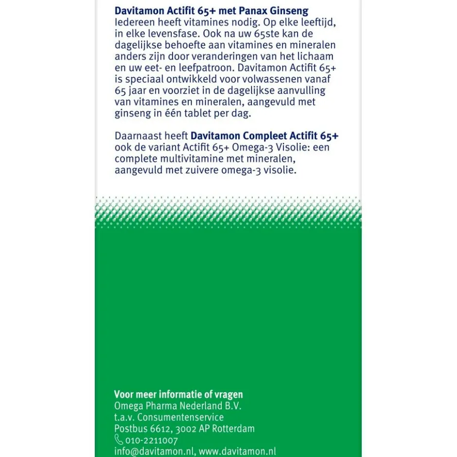 Davitamon Actifit 65+ Tabletten is speciaal ontwikkeld voor volwassenen vanaf 65 jaar en het voorziet in de dagelijkse aanvulling van belangrijke vitamines en mineralen, aangevuld met het natuurlijke plantenextract ginseng.