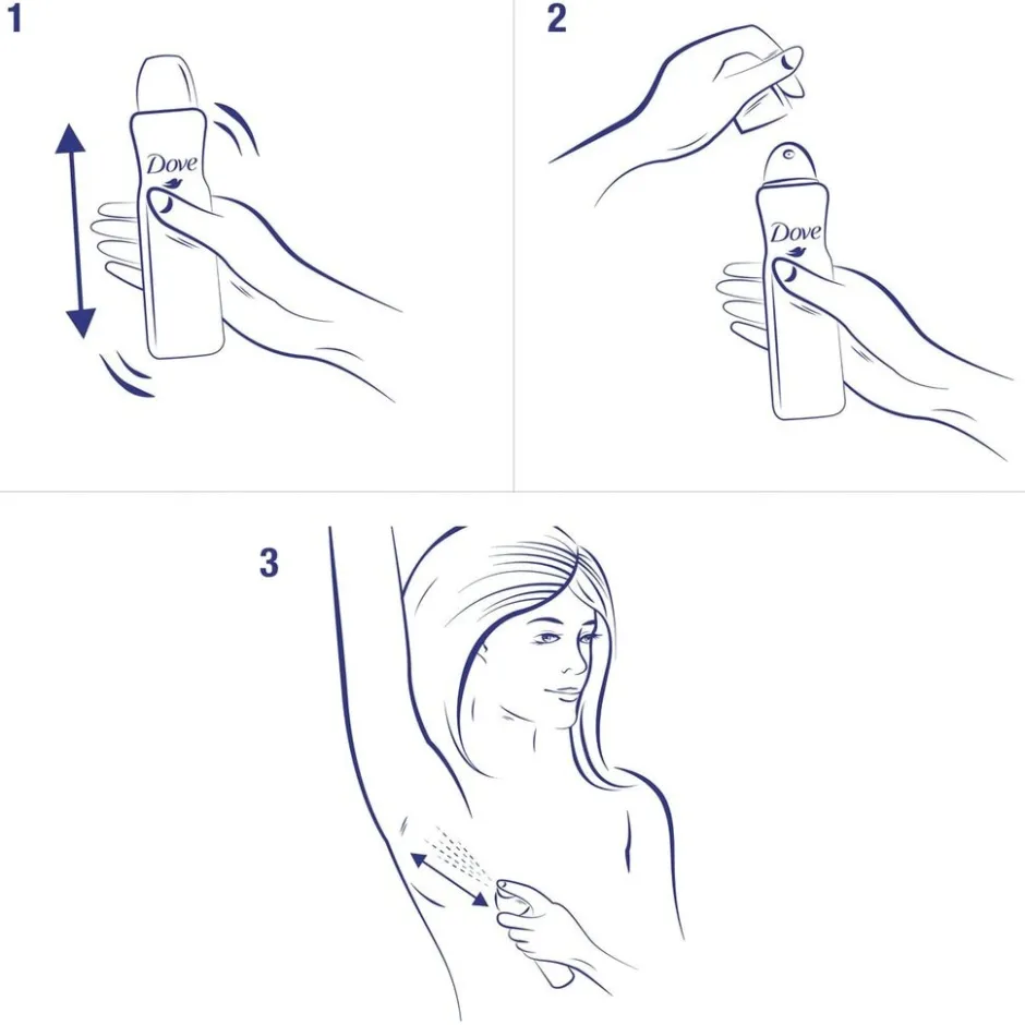 Voor het beste resultaat gebruik je de Dove Advanced Care Antitranspirant Original Deodorant Spray na het douchen als je huid droog en koel is. Schud de deodorantbus goed heen en weer, houd de spuitbus op vijftien centimeter van je oksel en spray de deodorant ongeveer twee seconden onder je oksel.