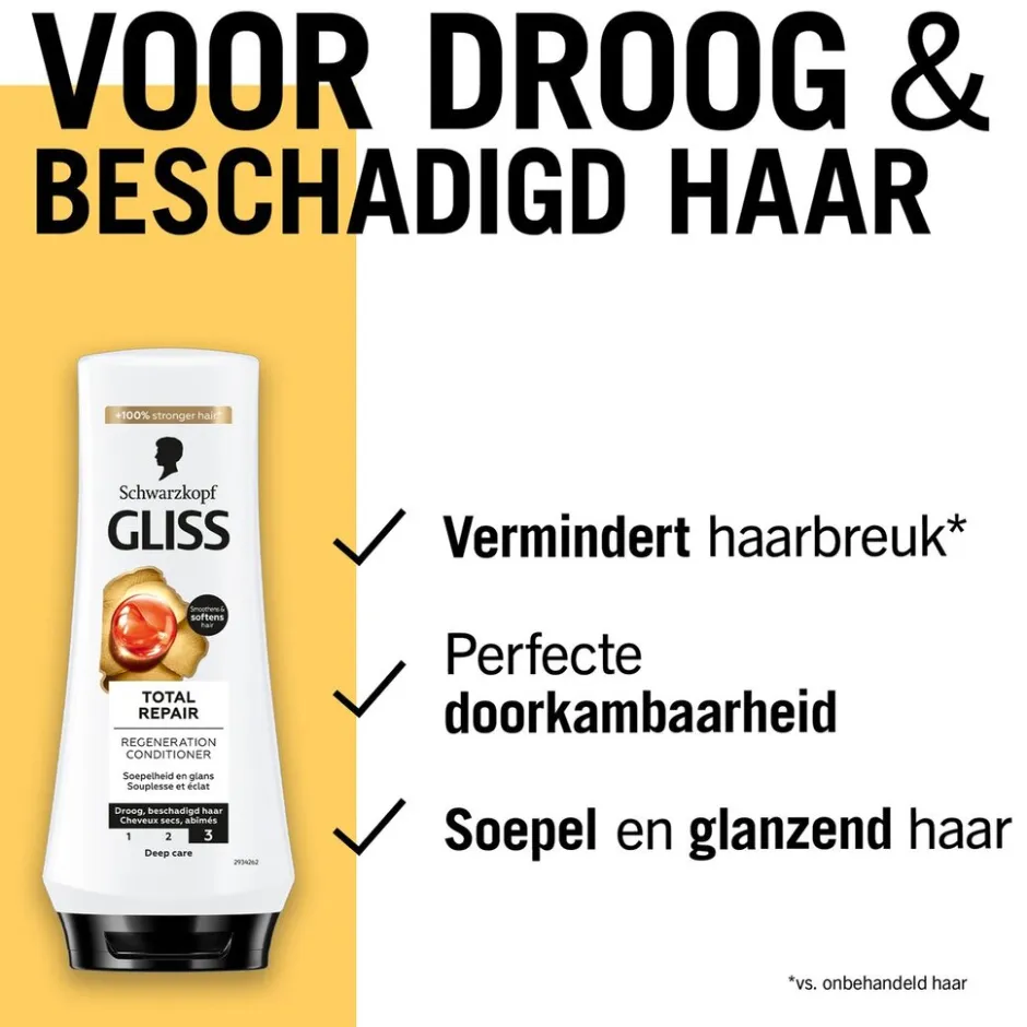 De Gliss Total Repair Regeneration Conditioner is een regeneratieconditioner voor droog, beschadigd haar. Het herstelt je haar en vermindert haarbreuk (ten opzichte van onbehandeld haar).