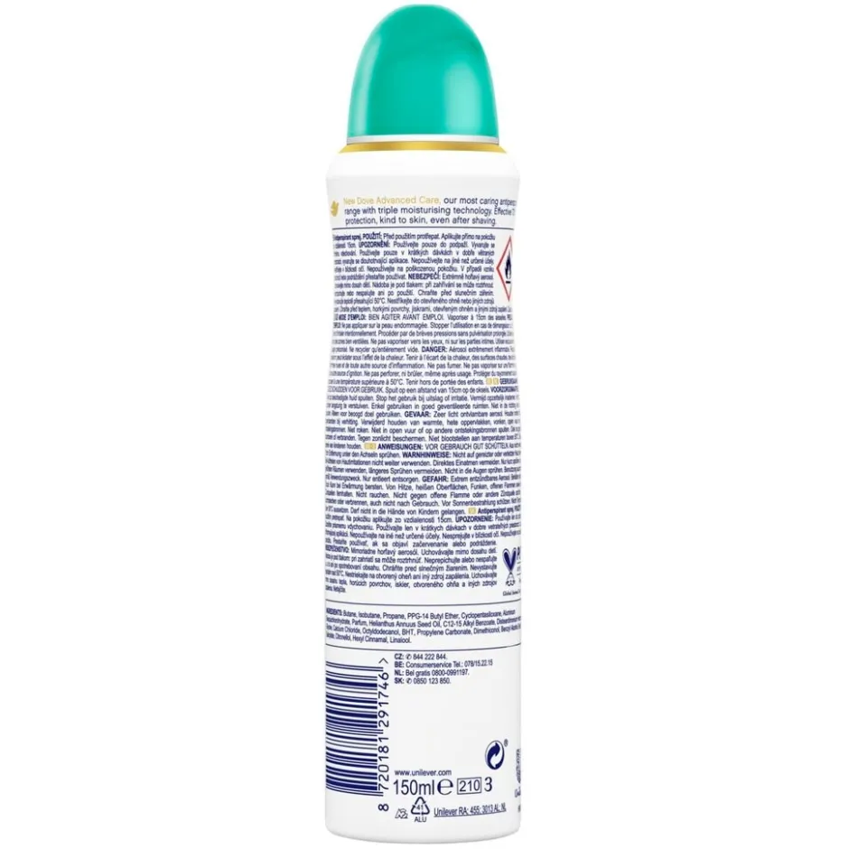 En het is niet alleen een verfrissende geur die de Dove Go Fresh Pear & Aloe Vera Antitranspirant Spray zo’n goede keuze maakt. De betrouwbare formule heeft een drievoudige werking: de Antitranspirant biedt tot 48 uur bescherming tegen zweet, bevat 1/4 hydraterende crème met 100% natuurlijke oliën en helpt om je gevoelige huid te herstellen van irritatie veroorzaakt door het scheren. Je krijgt prachtig zachte en gladde oksels in slechts drie dagen. Dus houd je Dove Go Fresh Pear & Aloe Vera Antitranspirant Spray in de buurt als je ’s ochtends uit de douche stapt en houd je oksels zacht en verzorgd met Dove antitranspirant.