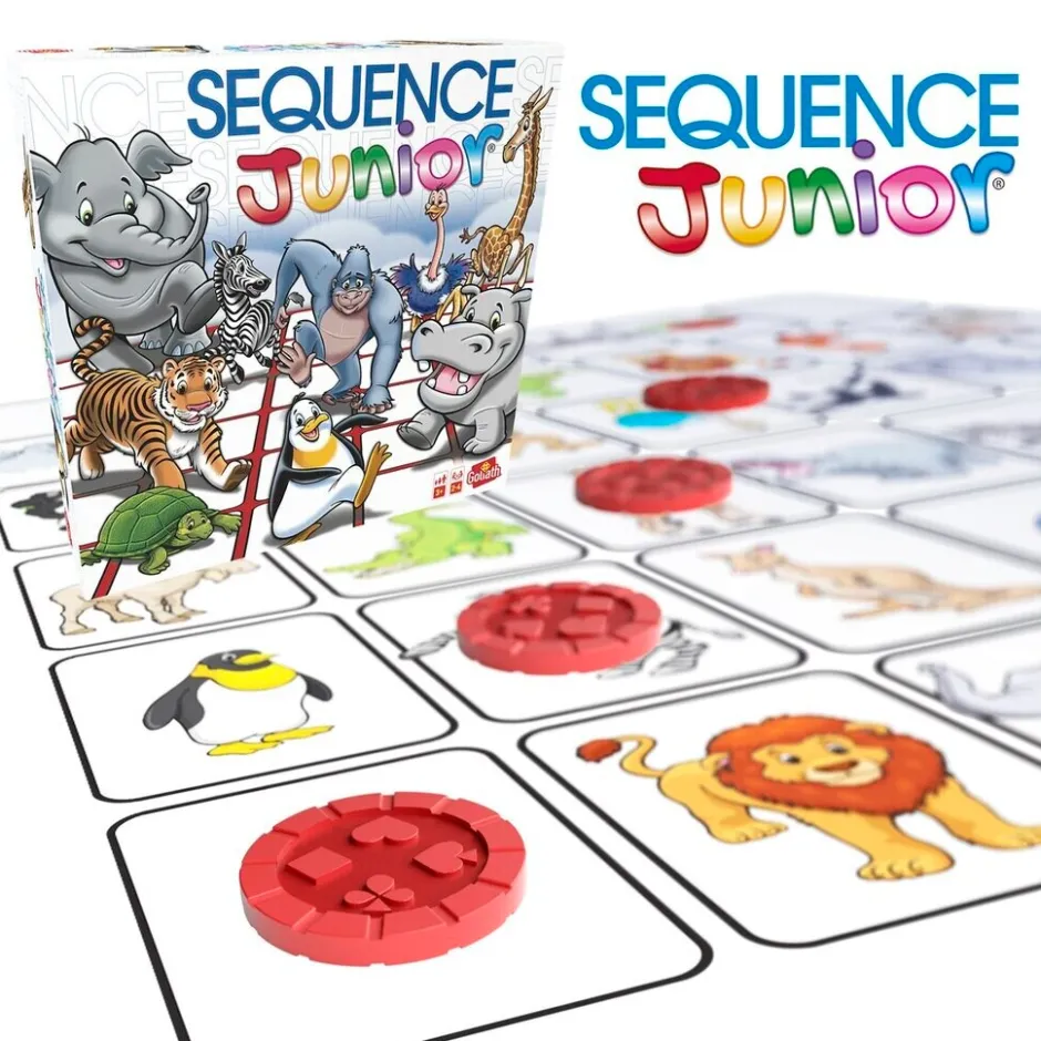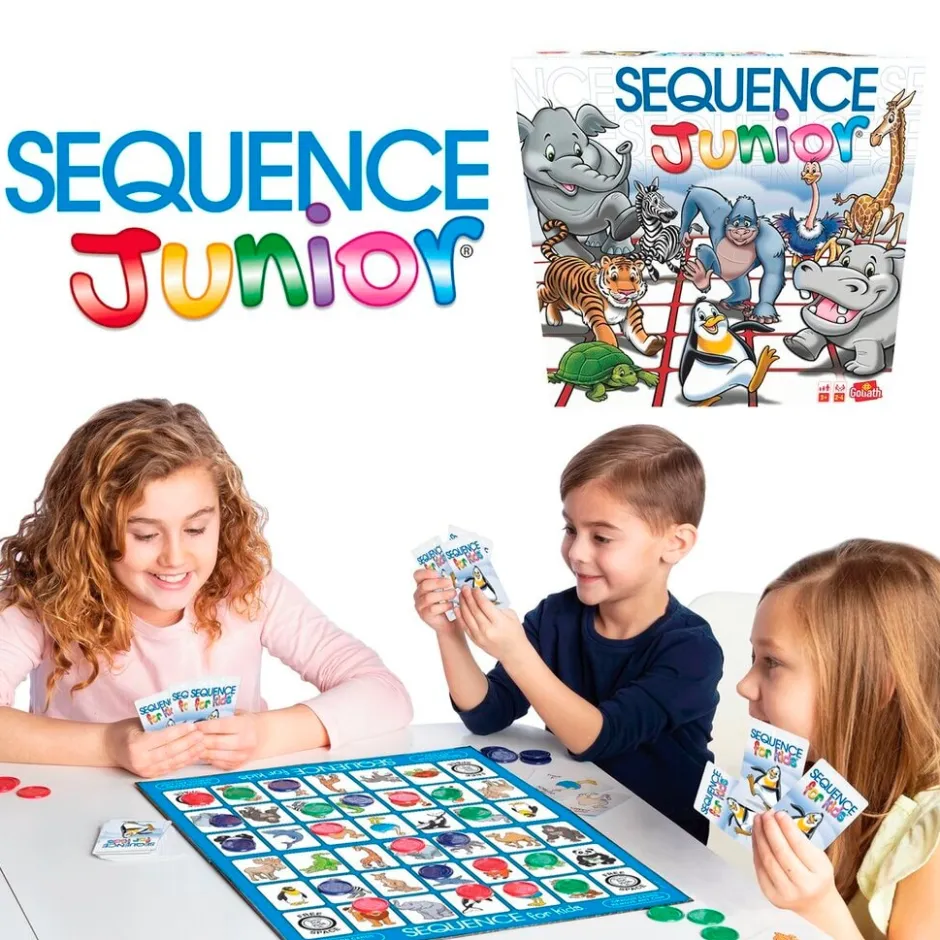 Spelen maakt leren nog leuker! Goliath Sequence Junior is de internationale klassieker, waarvan er miljoenen verkocht zijn. Je speelt kaarten uit om fiches op een groot speelbord te mogen leggen.