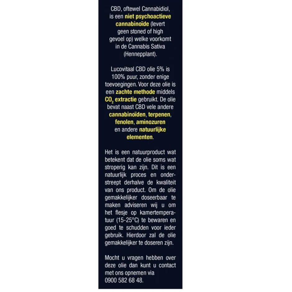 Lucovitaal CBD 5% Olie is 100% puur, zonder enige toevoegingen. Voor deze olie is een zachte methode middels CO2-extractie gebruikt.