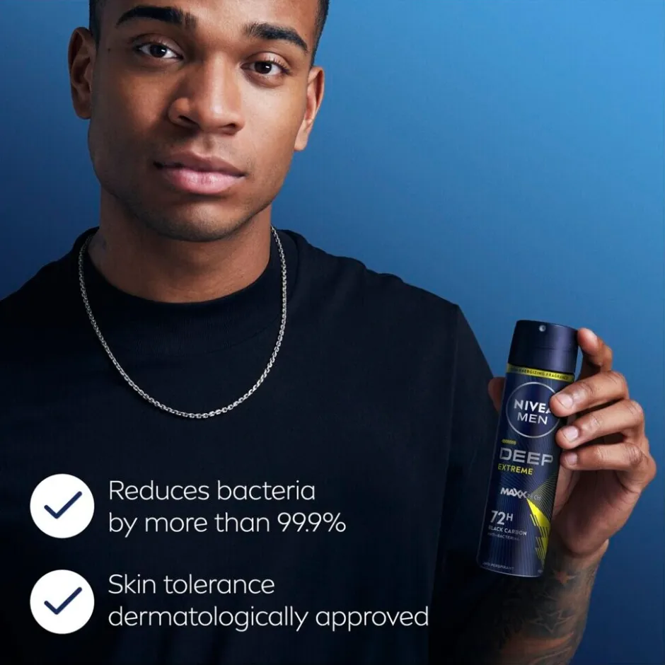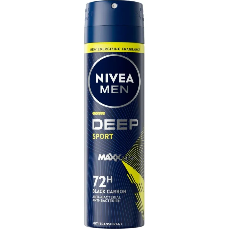 De kracht van de NIVEA Men Deep Sport Antitranspirant Spray zit in de Maxxtech-formule met zwarte koolstof. De spray geeft je een boost van frisheid dankzij de energieke geur.