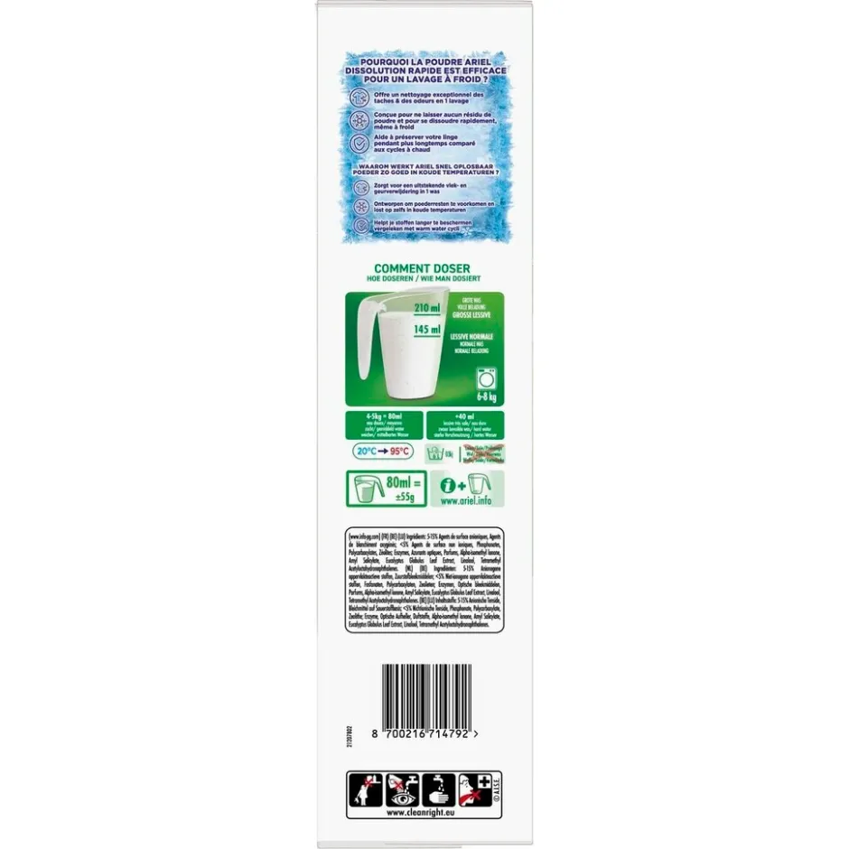 Ariel Original Waspoeder lost snel op, zelfs bij koude temperaturen Het wasmiddel verwijdert vlekken in een wasbeurt. Bovendien is het ontworpen om uitstekend te werken, zelfs in koudere cycli.