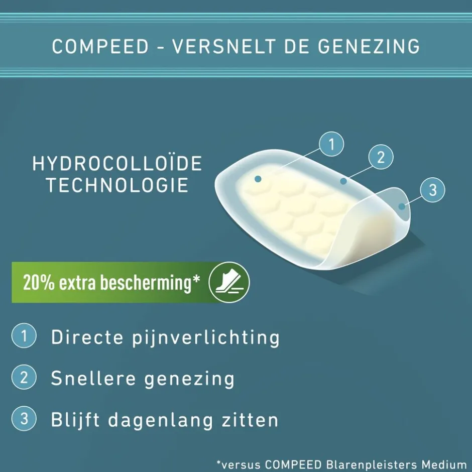 • Blijft goed plakken en heeft ultra dunne, schuin aflopende randen, zodat Compeed meebeweegt en meerdere dagen blijft zitten.