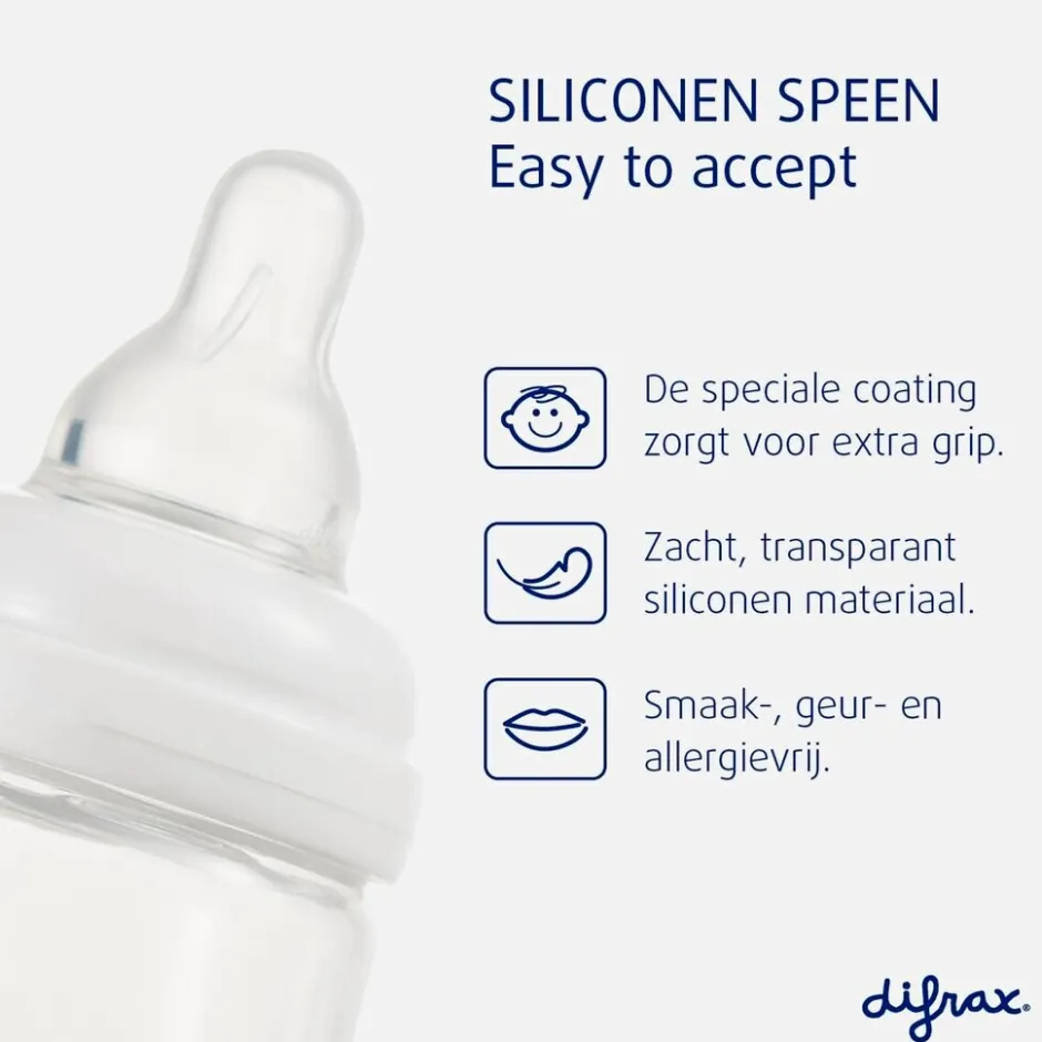 De Difrax Natural flessenspeen past op alle varianten van de Difrax Natural S-fles (170 ml en 250 ml) en de Difrax handgreepflessen. Ook passen ze op Dr. Brown’s flessen en op andere merken smalle babyflessen.