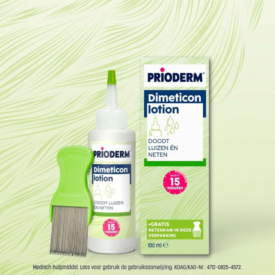 Prioderm Dimeticon Anti-Luislotion doodt hoofdluizen en neten in 15 minuten en is geur- en kleurloos. In de verpakking van de lotion is een metalen netenkam bijgesloten.