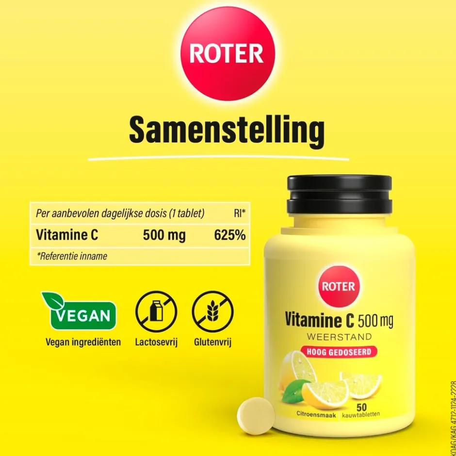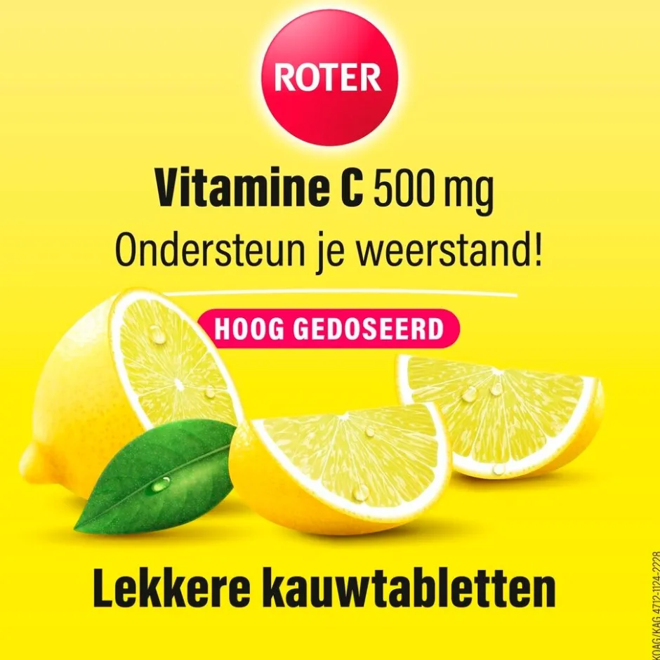 Roter Vitamine C 500 mg Kauwtabletten bevatten een hoge dosis vitamine C: één tablet bevat 500 mg vitamine C. Deze lekkere kauwtabletten hebben een frisse citroensmaak en zijn lactose- en glutenvrij.
