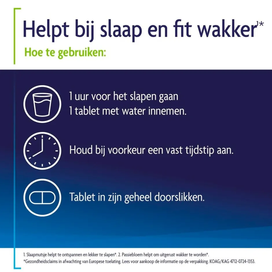 1 uur voor het slapen gaan één tablet met water innemen. Houd bij voorkeur een vast tijdstip aan.