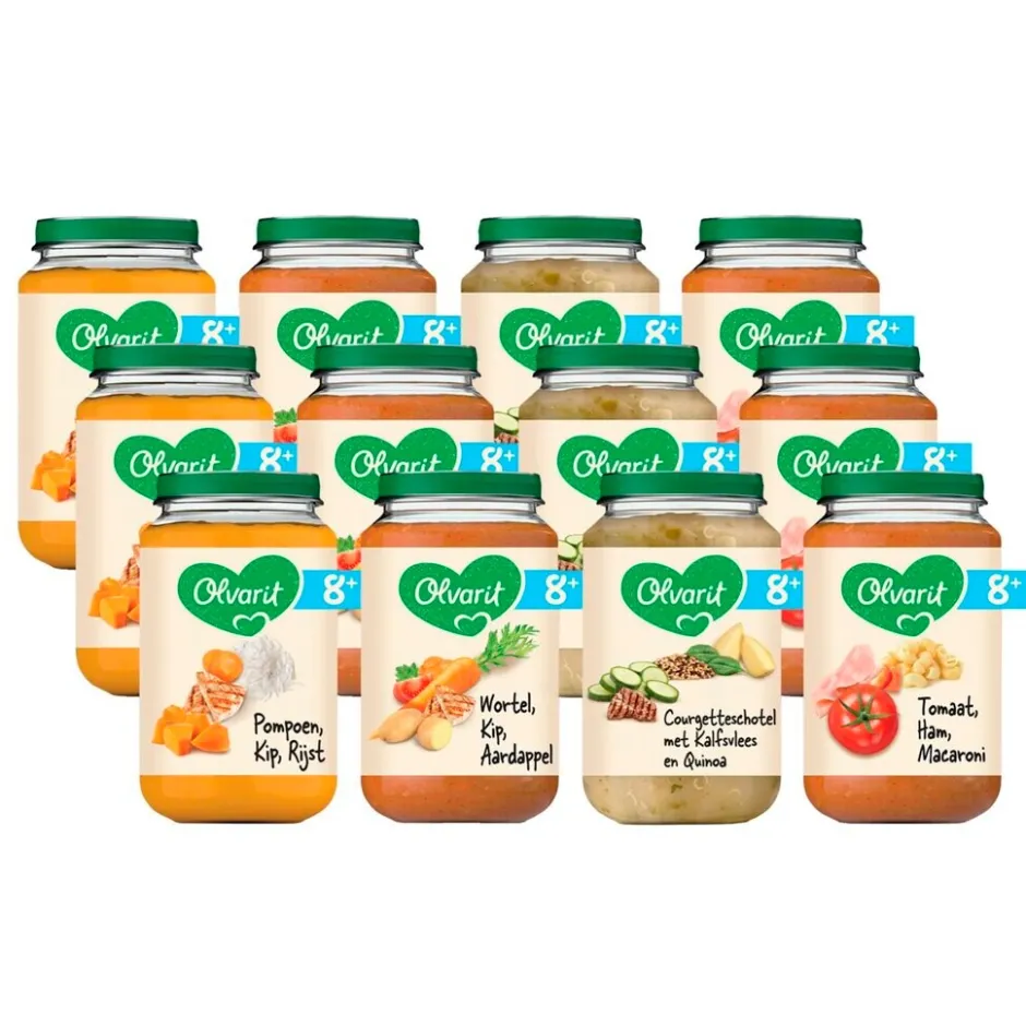 het Olvarit 8+M Maaltijd Variatiemenu bevat vier smaken babyvoeding. De babyhapjes met pure en natuurlijke ingrediënten voor baby’s vanaf 8 maanden hebben een herkenbare smaak en textuur die bijdragen aan de smaakontwikkeling.