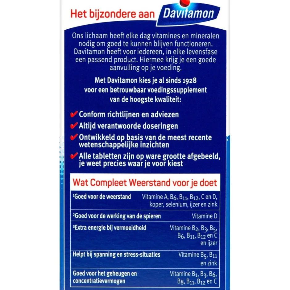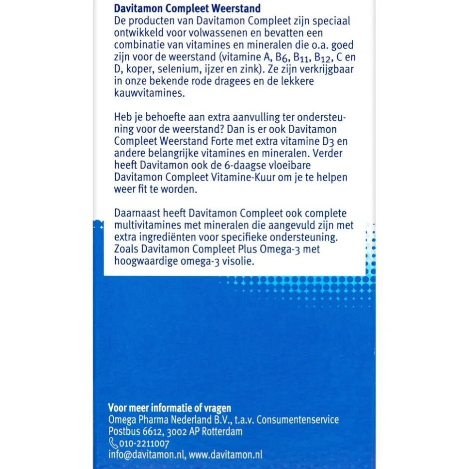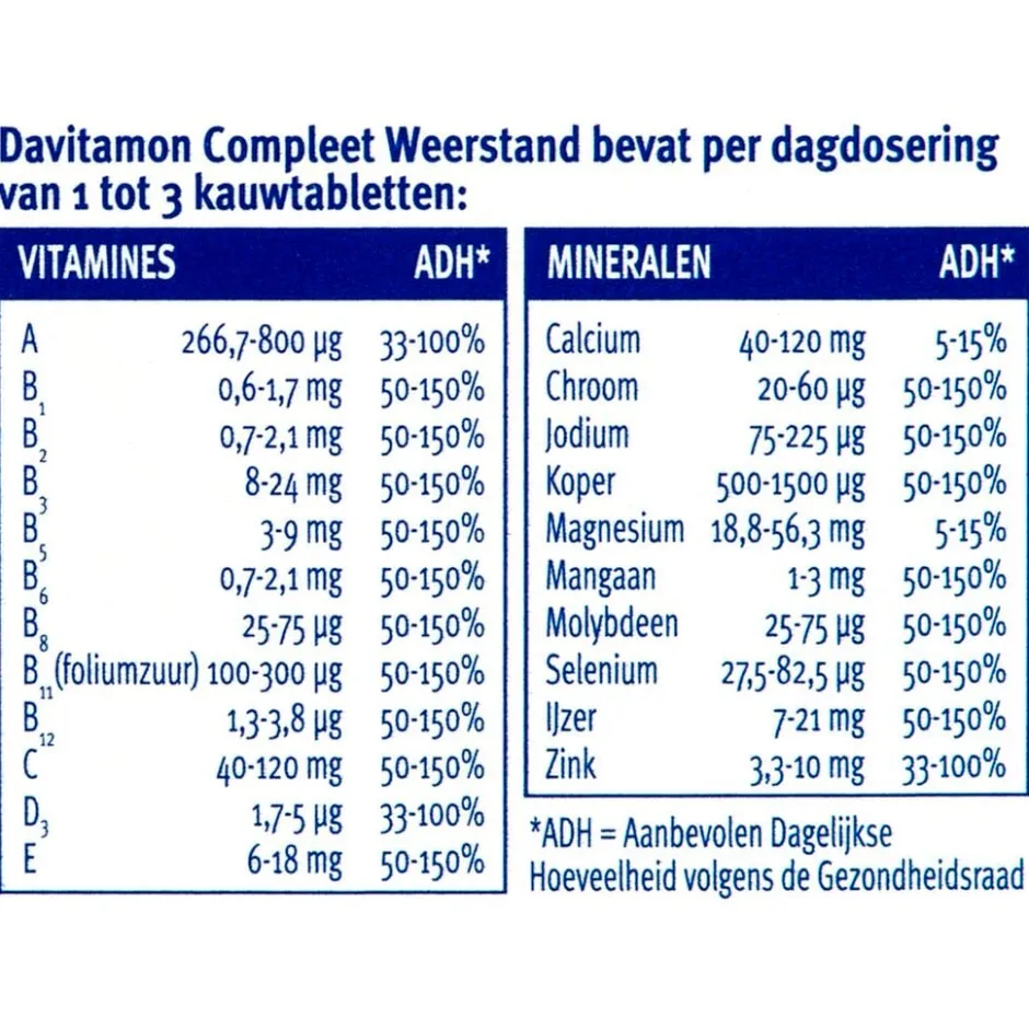 Davitamon Compleet Weerstand kauwvitamines bevatten geen suiker of conserveermiddelen.;Claimbeschrijving|¹Goed voor de weerstand Vitamine A, B6, B11, B12, C, D, koper, selenium, ijzer en zink.²Extra energie bij vermoeidheid Vitamine B2, B3, B5, B6, B11, B12, C, en ijzer. ³Goed voor de bescherming tegen invloeden van buitenaf Vitamine B2, C, E, koper, mangaan, selenium en zink. Goed voor de werking van de spieren Vitamine D. Helpt bij spanning en stress-situaties Vitamine B5, B11 en zink. Goed voor het geheugen en concentratievermogen Vitamine B1, B3, B6, B8, B11, B12 en C.