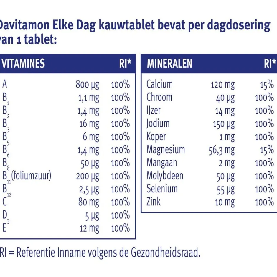 Davitamon Elke Dag biedt aanvulling tot 100% van de Aanbevolen Dagelijkse Hoeveelheid op belangrijke vitamines en mineralen.