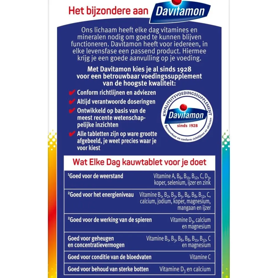 Davitamon Elke Dag Kauwtabletten zijn speciaal ontwikkeld voor de dagelijkse aanvulling van vitaminen en mineralen, voor zowel man als vrouw.