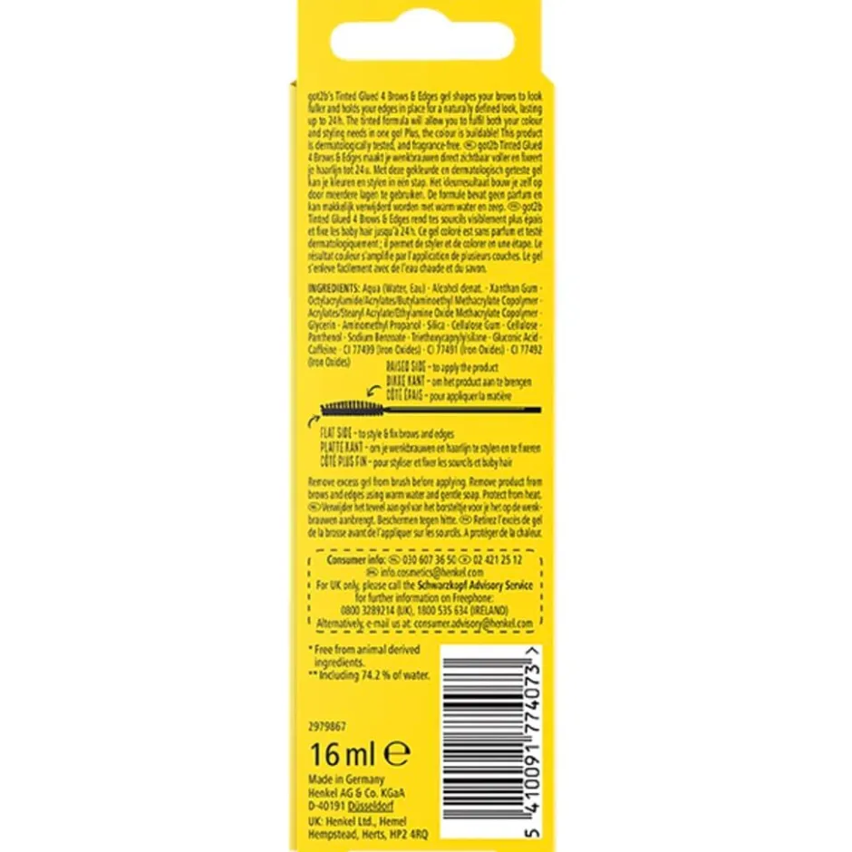 De Got2b Tinted Glued Dark Blonde to Brown 4 Brows & Edges Gel maakt je wenkbrauwen direct zichtbaar voller en fixeert je haarlijn tot 24 uur. Met deze gekleurde en dermatologisch geteste gel kleur en style je in één stap.