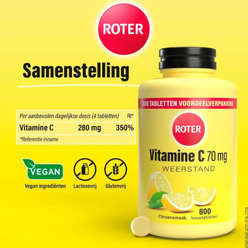 Roter Vitamine C 70mg Citroen Kauwtabletten ondersteunen je natuurlijke weerstand en je immuunsysteem. De lekkere kauwtabletten met frisse citroensmaak dienen als aanvulling op je voeding. Ze zijn lactose- en glutenvrij.