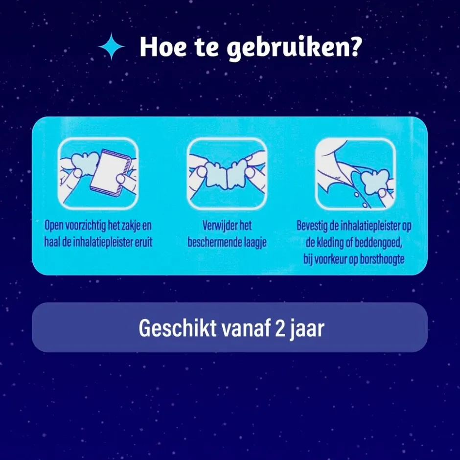 Niet meer dan één inhalatiepleister tegelijk gebruiken. Eén inhalatiepleister per nacht is voldoende om vrijer te kunnen ademen. Direct aanbrengen op de (droge) kleding, bijvoorbeeld op de pyjama. Op borsthoogte aanbrengen. De inhalatiepleister is gemakkelijk te bevestigen en te verwijderen.