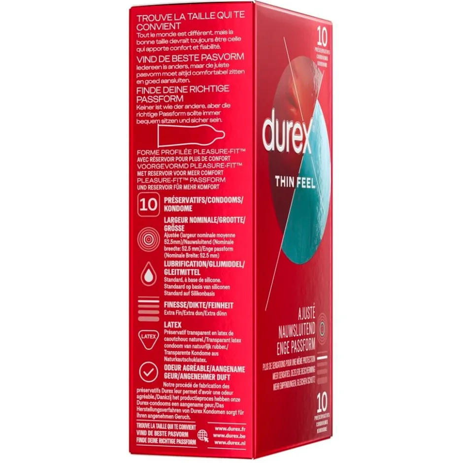 Je ervaart meer sensatie en dezelfde bescherming met Durex Thin Feel Close Fit Condooms. De condooms zijn extra dun, voor degenen die liever een nauwere maat gebruiken.