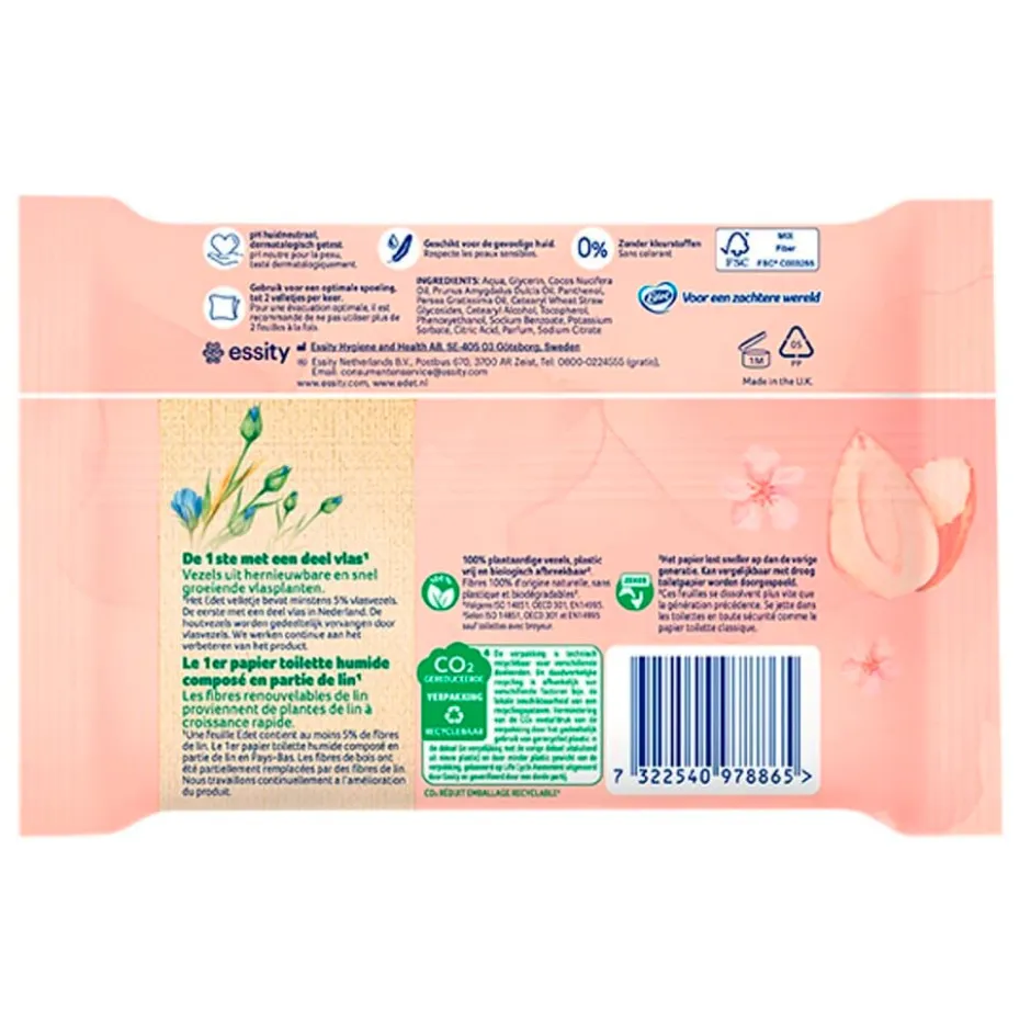 Het Edet Comfort Almond Milk Vochtige Toiletpapier is verrijkt met amandelmelk en is zowel zacht als reinigend.