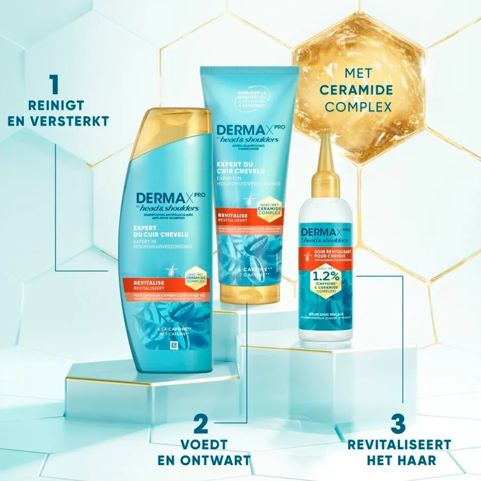 DermaXPro by Head & Shoulders Revitaliseert Antiroosshampoo helpt je natuurlijke huidbarrière te versterken, herstelt de natuurlijke balans van je hoofdhuid en helpt haaruitval te voorkomen.