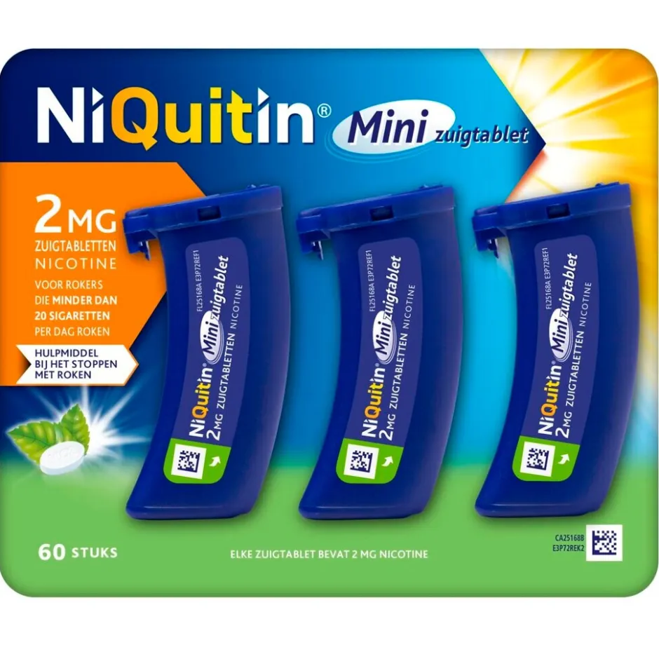 NiQuitin 2mg Minizuigtabletten bevatten nicotine. Geen langdurig gebruik zonder medisch advies. Lees voor gebruik de bijsluiter. Niet gebruiken bij kinderen onder de 12 jaar en niet-rokers. Jongeren (12 tm 17 jaar) dienen NiQuitin 2mg Minizuigtabletten alleen op advies van een arts of apotheker te gebruiken.