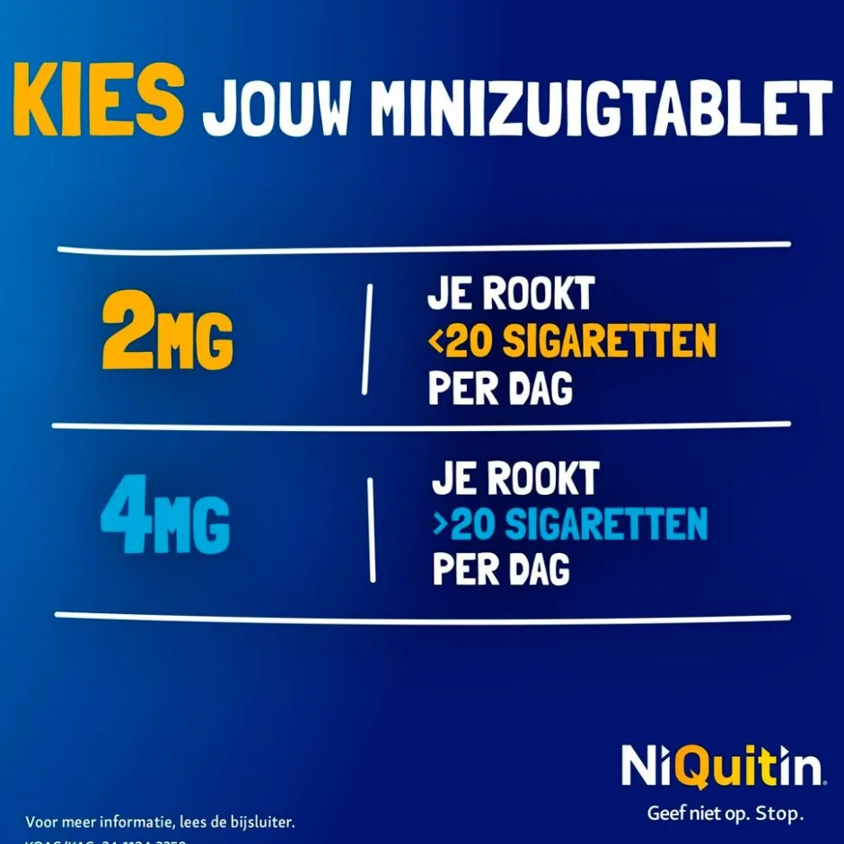 Rook je meer dan 20 sigaretten per dag? Neem dan NiQuitin 4mg Minizuigtablet. Rook je minder dan 20 sigaretten per dag? Neem dan NiQuitin 2mg Minizuigtablet .