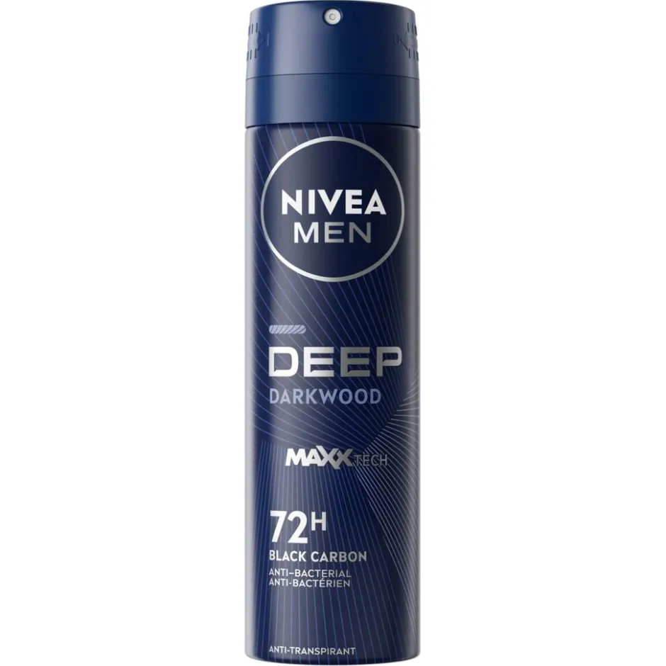 De NIVEA Men Deep Black Carbon Dark Wood Antitranspirant Spray biedt 72 uur lang betrouwbare bescherming die je huid tegelijkertijd verzorgt.