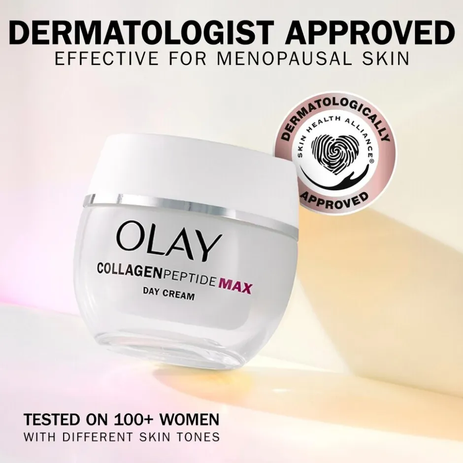 Tijdens de menopauze beginnen de collageenniveaus te dalen, waardoor je huid droog en minder stevig wordt. De Olay Collage Peptide MAX Hydraterende Dagcrème pakt verschillende tekenen van de overgang op je huid aan.