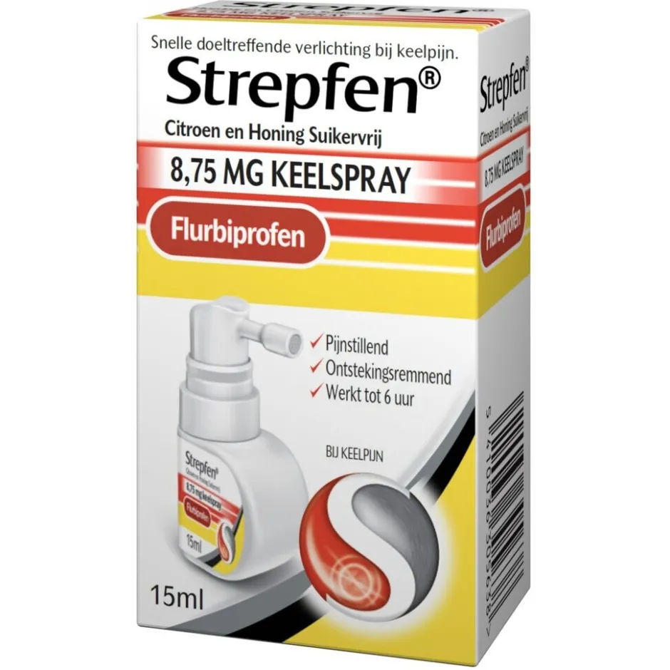 Strepfen Flurbiprofen Keelspray bevat 8,75 mg flurbiprofen. De spray vermindert zwelling en verlicht acute keelpijn. De keelspray zorgt voor een krachtige aanpak van je keelpijn, tot wel zes uur lang.