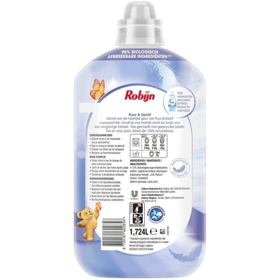 De Robijn Classics Puur & Zacht Wasverzachter bevat ingrediënten die voor 95% biologisch afbreekbaar zijn*. Bovendien zijn de flessen van Robijn wasverzachter gemaakt van 100% gerecycled plastic en 100% recyclebaar.