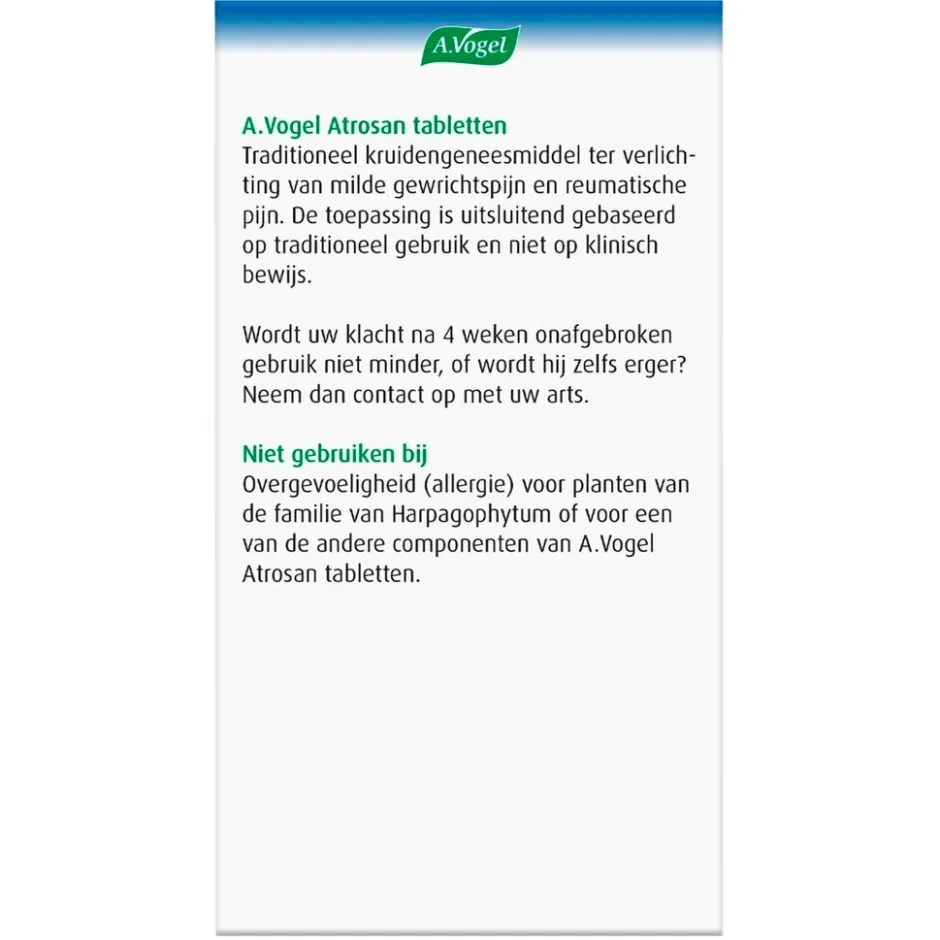 Pijnlijke gewrichten? A.Vogel Atrosan Tabletten zijn een natuurlijke pijnstiller bij milde gewrichtspijn en reumatische pijn, zoals door artrose of artritis. Atrosan bevat 480mg Harpagophytum (duivelsklauw).