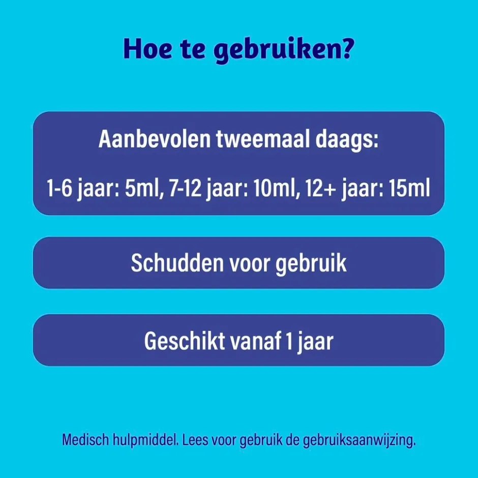Dampo Kids Alle Hoest is geschikt voor kinderen vanaf 1 jaar. De aanbevolen inname voor kinderen is tweemaal daags:
