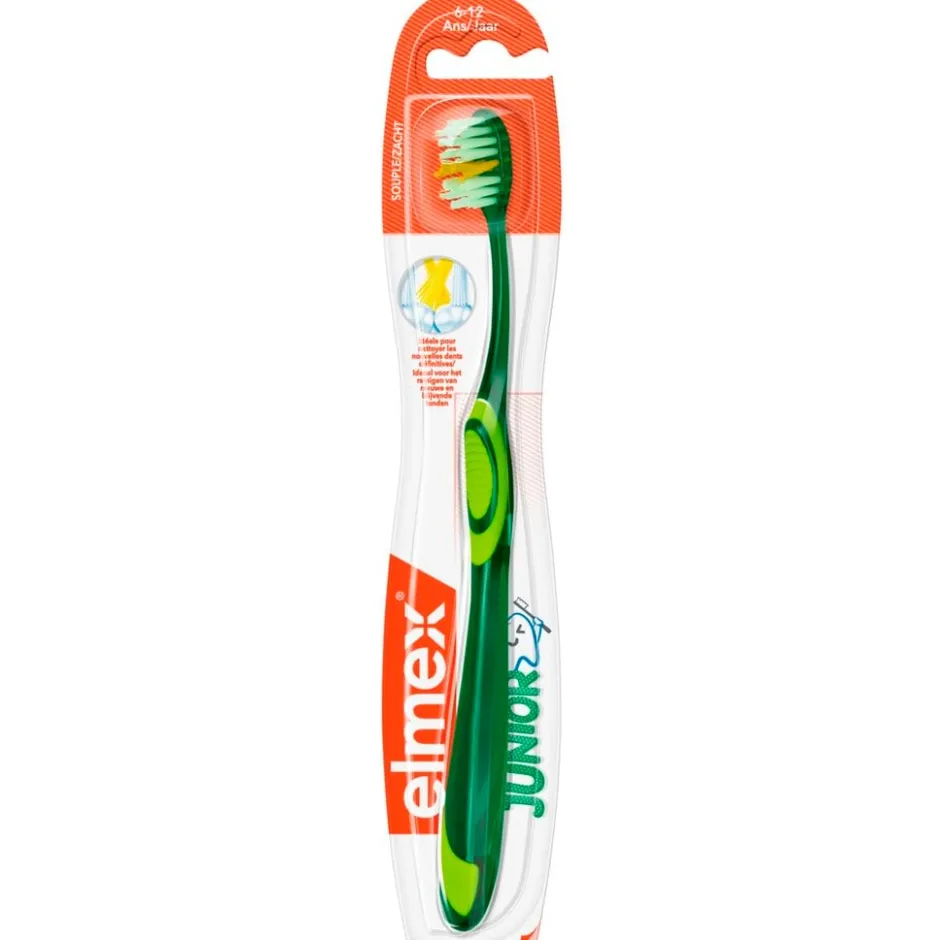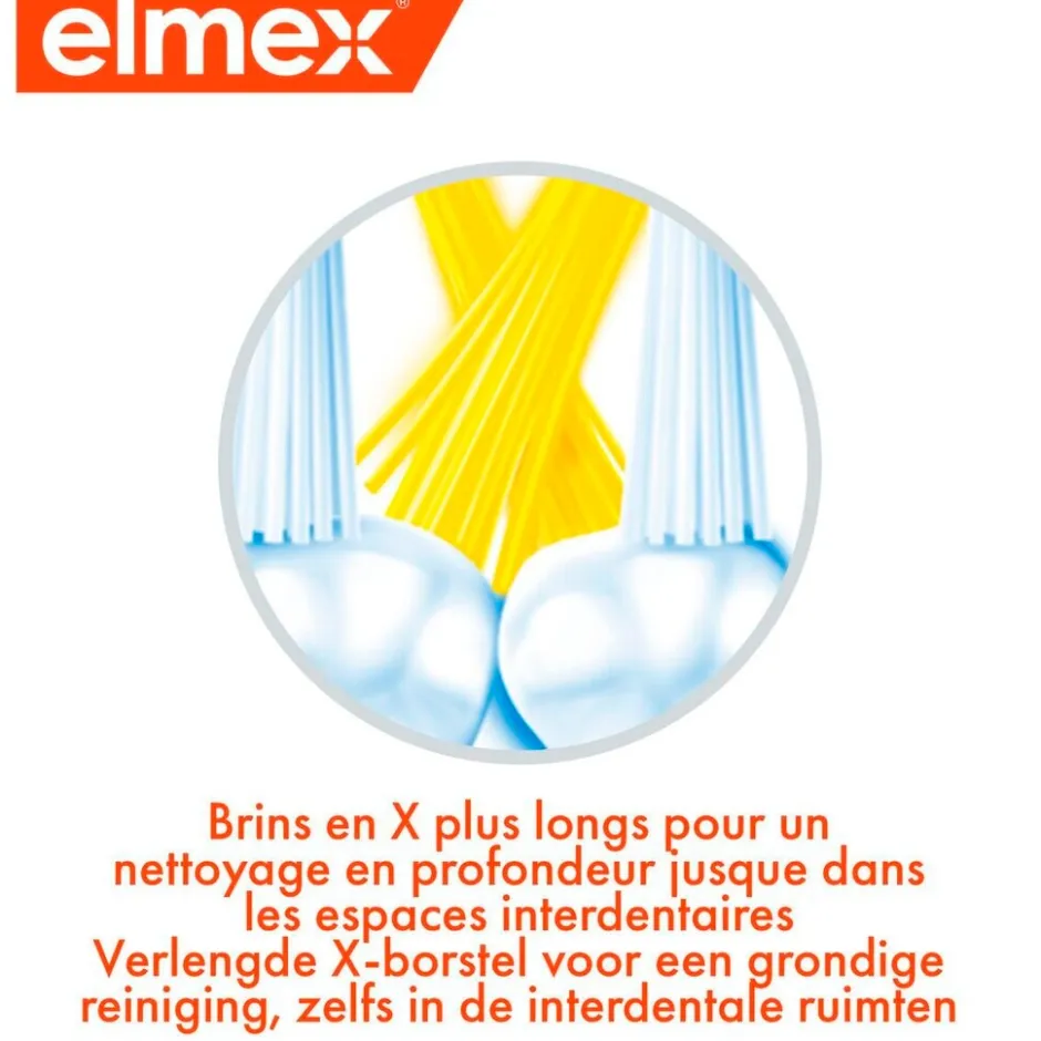 De Elmex Junior 6-12 jaar Tandenborstel heeft een kleine borstelkop en X-haren die helpen bij een grondige reiniging van verschillende tandgroottes in het wisselgebit.