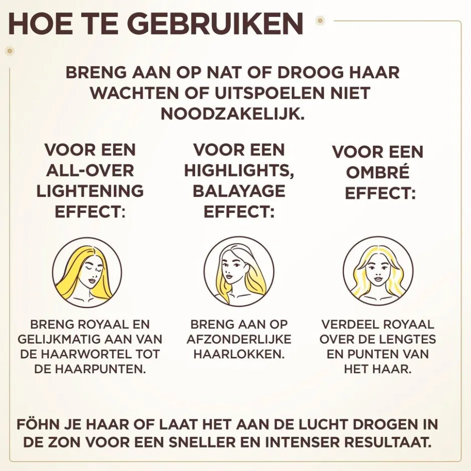 Verhelderende kamille en voedende bloemhoning zijn samengevoegd om je doffe blonde haren te laten herleven en geleidelijk een heldere blonde haarkleur met een zonovergoten natuurlijk effect te onthullen.
