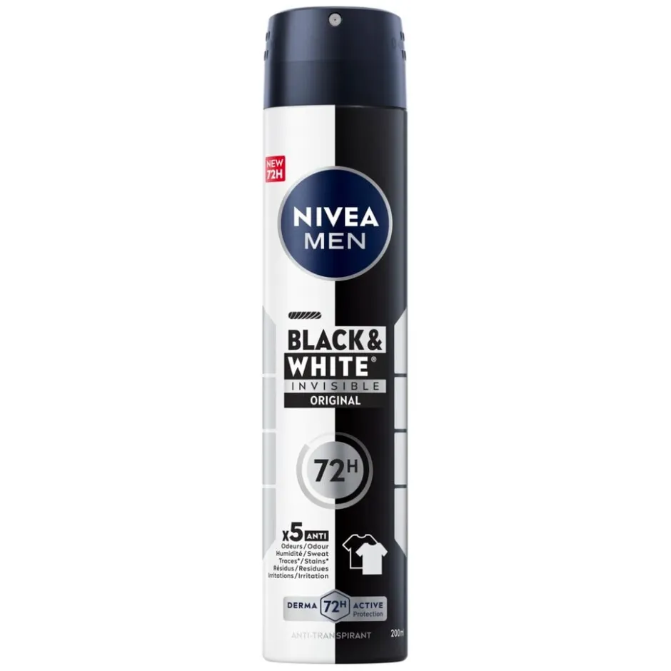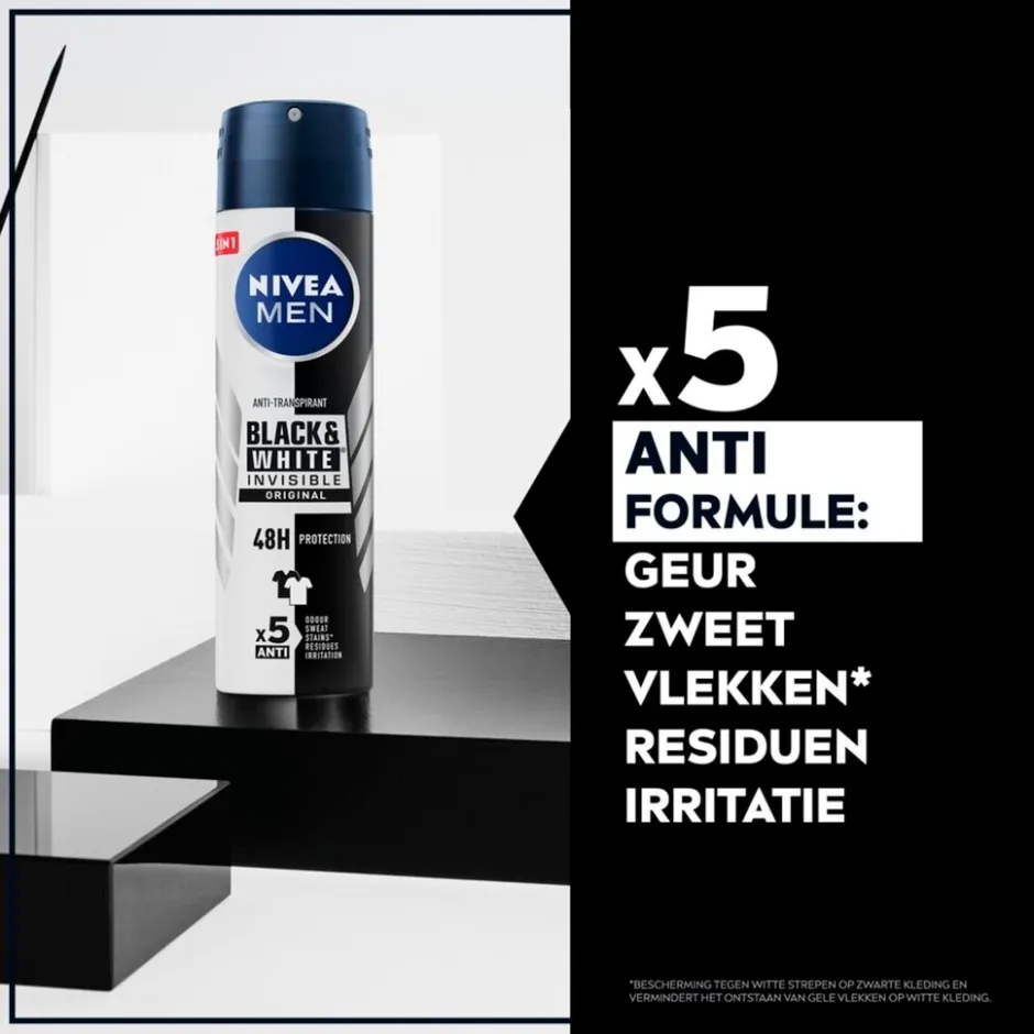 NIVEA Men Black & White Invisible Original Antitranspirant Spray biedt bescherming tegen witte vlekken op zwarte kleding en tegen gele vlekken op witte kleding dankzij de unieke gepatenteerde anti-vlekken technologie.