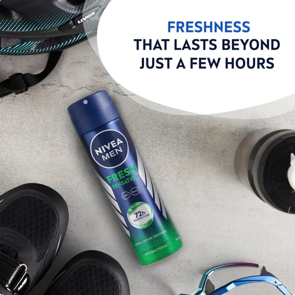 NIVEA Men Sensation Fresh Deodorant Spray biedt je 72 uur bescherming tegen zweet en geur. De spray is verrijkt met de InfiniFresh-formule die geur veroorzakende bacteriën actief bestrijdt.